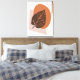 Canvas in a mid-century modern, minimalist, boho style print of a large leaf silhouette in dark coffee brown against geometric forms of rust and taupe, on a beige background