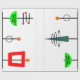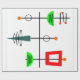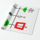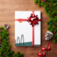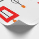 This wrapping paper has a mid-century modern design that looks like a mobile with half circles, skewed rectangle, triangle, lines, and circles in red, green, teal, orange and black.