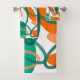 This towel set has a mid-century modern design of ovals and oval outlines in orange and teal on a field of white.