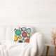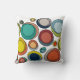 This throw pillow has a mid-century modern design of groups of three ovals in retro colors scattered across the design.