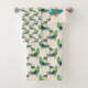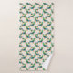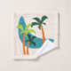 This towel set features a Mid Century inspired pattern of simple palm tree graphics in orange and green set around a boomerang shaped oasis or swimming pool in a vivid aqua blue. The sand background colour may be edited.