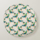 This round pillow is embellished with a Mid Century influenced design of simple palm tree graphics in orange and green set around a boomerang shaped oasis or swimming pool in a vivid aqua blue. The sand background colour may be edited.
