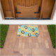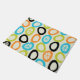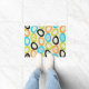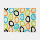 A pattern of colourful shapes that resemble rocks make up this 1950s atomic age-inspired abstract art design. Colours are chartreuse, orange, sky blue and black.
