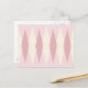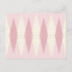 This Mid Century Modern Pink Argyle Postcard features a First Lady pink background and a pattern of mod, translucent, blush diamonds overlaying larger, vintage cream diamonds with gold coloured, space age speckles. This minimalist inspired, deconstructed argyle is a simplistic throwback of the larger than life atomic era that dominated the decorating landscape of the 1950s and 1960s. This kitschy design is reminiscent of everything from retro Palm Springs’ bowling alley signs to classic TV shows to the television trays you used at your grandma’s house.