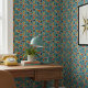 Set against a rich blue background, the palette includes burnt orange, teal, mustard yellow, charcoal gray, and soft ivory accents. The cool blue base adds depth and contrast, making this wallpaper ideal for statement accent walls, living rooms, dining spaces, home offices, or retro-inspired interiors. This design blends iconic mid-century style with vibrant color and timeless appeal. Search ID1224 to see other designs in this series. Note: design adapted from generative content.