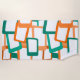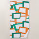 This beach towel has a mid-century modern design of skewed rectangles with white holes in shades of teal and shades of orange.