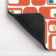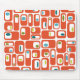 This mouse pad has a mid-century modern design of orange rectangles with white rectangles and green and blue ovals inside.