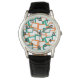 This men's watch has a mid-century modern design of skewed rectangles with white holes in shades of teal and shades of orange.