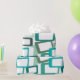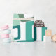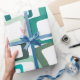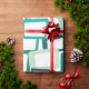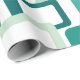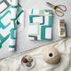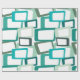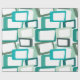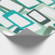 This wrapping paper has a mid-century modern design of skewed rectangles with white holes in shades of blue-green.