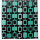 A simple minimalist pattern inspired by 1950s atomic era abstract art, with columns of rounded squares in blue-green, with a black background.