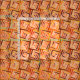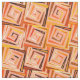 Modern abstract design of squared spirals in light coral pink with earth-tone neutrals and accents of orange and gold