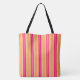 Printed tote bag in a Mid-Century Modern striped pattern in shades of soft orange, and fuchsia pink, accented with pastel orange and pink