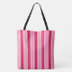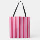 Printed tote bag in a Mid-Century Modern striped pattern in shades of medium pink, fuchsia pink, and burgundy / wine red, accented with pastel pink