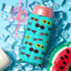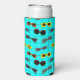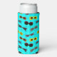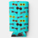 This seltzer can cooler has a mid-century modern design of retro sunglasses on a field of blue with a grid.