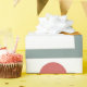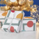 This wrapping paper has a Mid-century modern design of gray trapezoids with colorful circles on them.