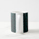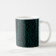 This mug has a mid-century modern design of lines with half-rectangles in turquoise on a field of black.