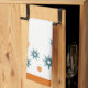 Brighten up your kitchen with this stylish atomic-era mid-century kitchen towel. This design features starbursts in shades of turquoise blue, red- orange and yellow; framed in bright orange.