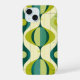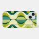 This artwork features a striking mid-century modern pattern composed of bold, abstract shapes and curves. The design is chraacterised by a repeating motif of elongated ovals and teardrop shapes in varying shades of green, teal, and yellow. Set against a light cream background with subtle distressed textures, the pattern creates a sense of depth and movement. The retro-inspired colour palette and geometric forms give the composition a vintage yet timeless appeal, making it a vibrant and eye-catching piece.