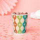 This is paper cup featuring mid century modern atomic starbursts pattern placed on ogee ovals in red, green, mustard and teal