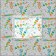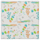 Mid-century modern space age atomic fabric with abstract shapes in colours of teal, orange and avocado green on a light grey background.