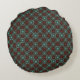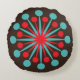 This round pillow features Mid Century modern style starburst motifs in turquoise and red and a coordinating pattern on the reverse all set against a brown background that may be customised to suit your decor.