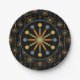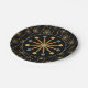 This decorative paper plate features a graphic design inspired by Mid Century Modern styles with thin stripes and starburst motifs made up of circles in lively retro hues. All elements of this design may be customised with your choice of colour.