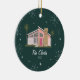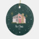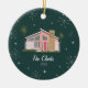 Illustration of a pink midcentury modern style house decorated with lights, wreaths, and Christmas trees. Snowflake pattern background. Personalise the name and year.
