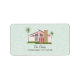 Illustration of a pink midcentury modern house with palm trees over a light blue background with sheer white midcentury inspired pattern. Custom name and address.