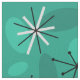 A 1950s retro styled mid century modern design with sputnik starbursts against a turquoise background with circle shapes.