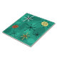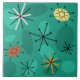 A 1950s retro styled mid century modern design with sputnik starbursts against a turquoise background with circle shapes.