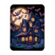 The image depicts a stylised haunted house at night. The house is tall with pointed roofs and several windows emitting a yellow glow, suggesting interior light. Surrounding the house are numerous bats in flight against a dark sky. In the foreground, there’s a graveyard with tombstones, adding to the eerie atmosphere of the scene. This image is interesting due to its thematic elements commonly associated with horror or Halloween and its vibrant yet dark colour palette which sets a spooky mood.