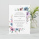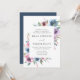 Elegant floral wedding invitations displaying your wedding details framed by a border of purple, mauve & blue watercolor flowers with lush green leaves. The back features a solid dark blue background. Designed to coordinate with our Midnight Blooms wedding collection.