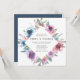 Elegant floral wedding invitations displaying your wedding details framed by purple, mauve & blue watercolor flowers with lush green leaves. The back features a solid dark blue background. Designed to coordinate with our Midnight Blooms wedding collection.