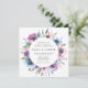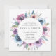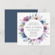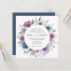 Elegant floral wedding invitations displaying your wedding details encircled by a wreath of purple, mauve & blue watercolor flowers with lush green leaves. The back features a solid dark blue background. Designed to coordinate with our Midnight Blooms wedding collection.