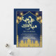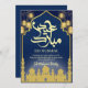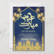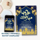 A stunning high-contrast Eid card featuring a bright golden mosque silhouette and hanging lanterns against a deep midnight blue starry background. Perfect for a premium holiday message.
