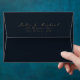 Midnight Dark Navy Blue Calligraphy Script Wedding Invitation Suite Envelope with Gold Image Liner. Moody, Romantic and Modern. The blue texture looks like velvet. Gold colour Calligraphy Script. Part of the Julia Wedding Invitation Suite. Return address is on the back top flap of the envelope and can be removed by just deleting the text.