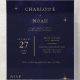 A minimalist modern celestial wedding invitation features a simple and elegant design. It includes a gold foil moon and stars that gently sparkle, set against a midnight blue background. The invitation uses classic serif typography, which adds a traditional and formal touch with its neat and clear style. The combination of modern design, shiny gold details, and timeless fonts makes the invitation both beautiful and inviting, perfect for announcing a special and elegant wedding day.
