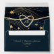 Immerse your guests in celestial romance with our enchanting 5x7 midnight blue wedding envelope. Crafted with mystical elegance, its modern design features a shimmering gold rope heart monogram, intertwining the initials of the bride and groom. Against the backdrop of a starry night, this invitation promises an unforgettable journey under the midnight sky. Complete with a celestial-themed return address, it sets the stage for a love story written in the stars.