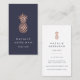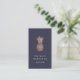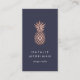 Elegant vertical business cards feature a faux rose gold foil pineapple illustration on a rich midnight blue background with two lines of custom text in crisp white. Customise the back with your full contact details, displayed beneath a smaller pineapple illustration.
