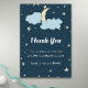 Cute midnight blue baby shower thank you card with a starry night and yellow moon behind some blue clouds. The illustration is made so it looks in three dimensions but note that it's just an effect and this is actually a print. All the text is in white and can be personalised. Illustrated and designed by Patricia Alvarez.