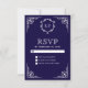 Elegant RSVP card featuring an elegant white ornate border and beautiful monogram against a dark blue background.