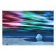In the bay of a frozen land a great iceberg floats in the cold blue sea. Snowflakes and stars speckle the scene, and in the sky overhead the aurora glows in shades of pink, lavender, green, and blue.