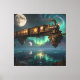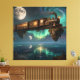 A vintage steampunk train glides across floating islands under twin moons and swirling auroras, its glowing gears and clockwork engine cutting through a dreamlike sky above a luminous, otherworldly sea.