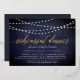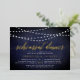 Our elegant rehearsal dinner or cocktail party invitations in chic midnight blue and white feature a richly textured midnight blue background with strings of white lights across the top, and "rehearsal dinner" in chic gold foil calligraphy script typography. Personalise with your ceremony rehearsal and rehearsal dinner details beneath. Includes space for the rehearsal timing and church or venue address. A chic design in dark navy and white for modern couples and elegant events.