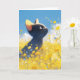 This enchanting greeting card features a curious black cat gazing up at a vibrant field of yellow and blue flowers against a clear blue sky. The whimsical illustration combines the playful innocence of a kitten with the beauty of nature, capturing the spirit of a sunny, flower-filled meadow. Perfect for cat lovers, nature enthusiasts, and anyone who appreciates art with a touch of magic, this card makes an ideal choice for birthdays, thank-you notes, or simply bringing a smile to someone’s day. The vibrant colours and heartwarming scene create a cheerful and uplifting greeting card suitable for any occasion.