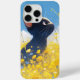 A black cat with large, curious eyes sits amidst a field of vibrant yellow and blue flowers, looking up towards the sky. The background is a clear blue sky with fluffy white clouds.