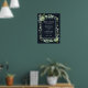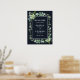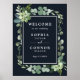 This wedding welcome sign features painted watercolor succulent, eucalyptus, and botanical green leaves with a rectangle frame on a midnight navy blue background. Matching items are also available.