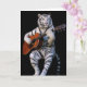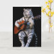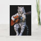 A tasteful and understated greeting card showcasing a calm white tiger illuminated against darkness as it plays an acoustic guitar. Perfect for sending thoughtful notes with a touch of artistic sophistication.