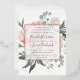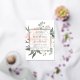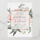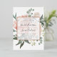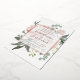 Elegant and modern floral wedding invitation features a background of peachy pink peonies accented with lush green botanicals and foliage. Your wedding details are overlaid on a sheer white element in elegant lettering accented with hand lettered script. Rose gold foil trim completes the look for a luxe finish.