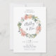 Elegant spring floral wedding invitation features your names encircled by a wreath of pink and peach peony flowers with lush botanical green foliage.